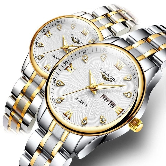 GUANQIN Couple Watch Set Men Women lovers Watch Stainless Steel Date Luxury Gold Quartz Watch Women Clock Ladies Wrist Watch